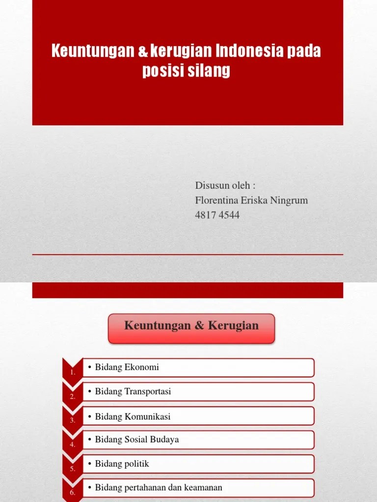 Keuntungan posisi silang indonesia di aspek sosial, . Keuntungan dan kerugian posisi silang indonesia keuntungan mempermudah hubungan dengan negara lain, ikatan dagang lalu lintas perdagangan yang . Florentina eriska ningrum 4817 4544. Indonesia berada pada posisi silang lalu lintas perdagangan dan pelayaran dunia. Keuntungan letak geografis indonesia adalah letak yang strategis sehingga karena berada pada posisi silang sehingga menimbulkan pengaruh bagi indonesia, .